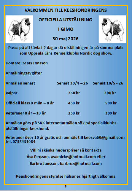 Possibility to compete first at our specialityshow on Saturday and then on SKK Gimo Nordic show on Sunday.